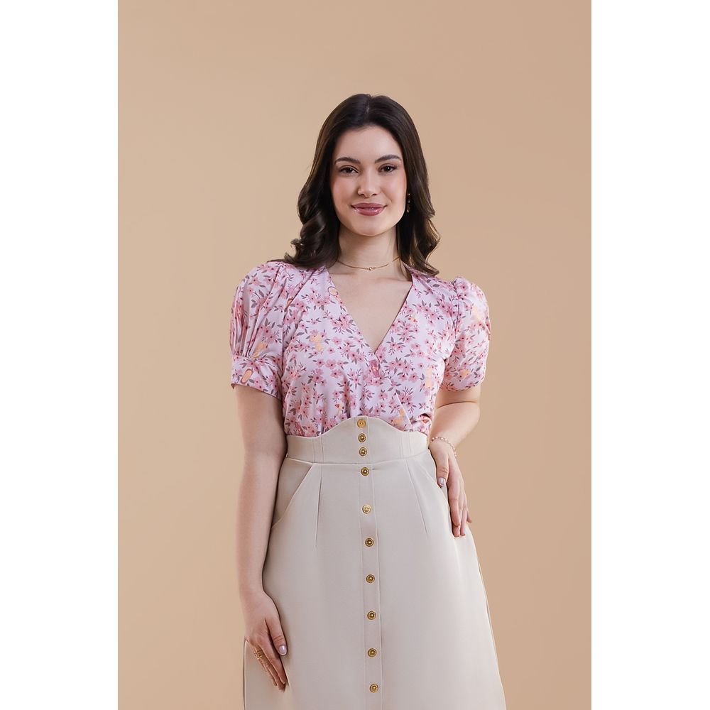 | Conceito Criativo | A "Blusa Transpassada Sakura - Blush" é uma criação da coleção Brumas de Vênus — Verão 2026 da Toda Frida. Essa é uma estampa lançada originalmente em 2020 que retorna agora repaginada: a arte exclusiva inspirada em Sakura Cardcaptors ressurge renovada, trazendo seus buquês de flores de cerejeira (sakuras) e elementos icônicos como as cartas Clow e Sakura, o báculo de estrela e o fiel companheiro Kero. O design da peça se inspira na personalidade leve e doce de Sakura, traduzida no decote transpassado, na barra peplum, na cintura marcada e nas mangas bufantes. Essa é uma peça que une poesia, romantismo e nostalgia, permitindo que você vista seu anime favorito com a essência encantadora da Toda Frida. |