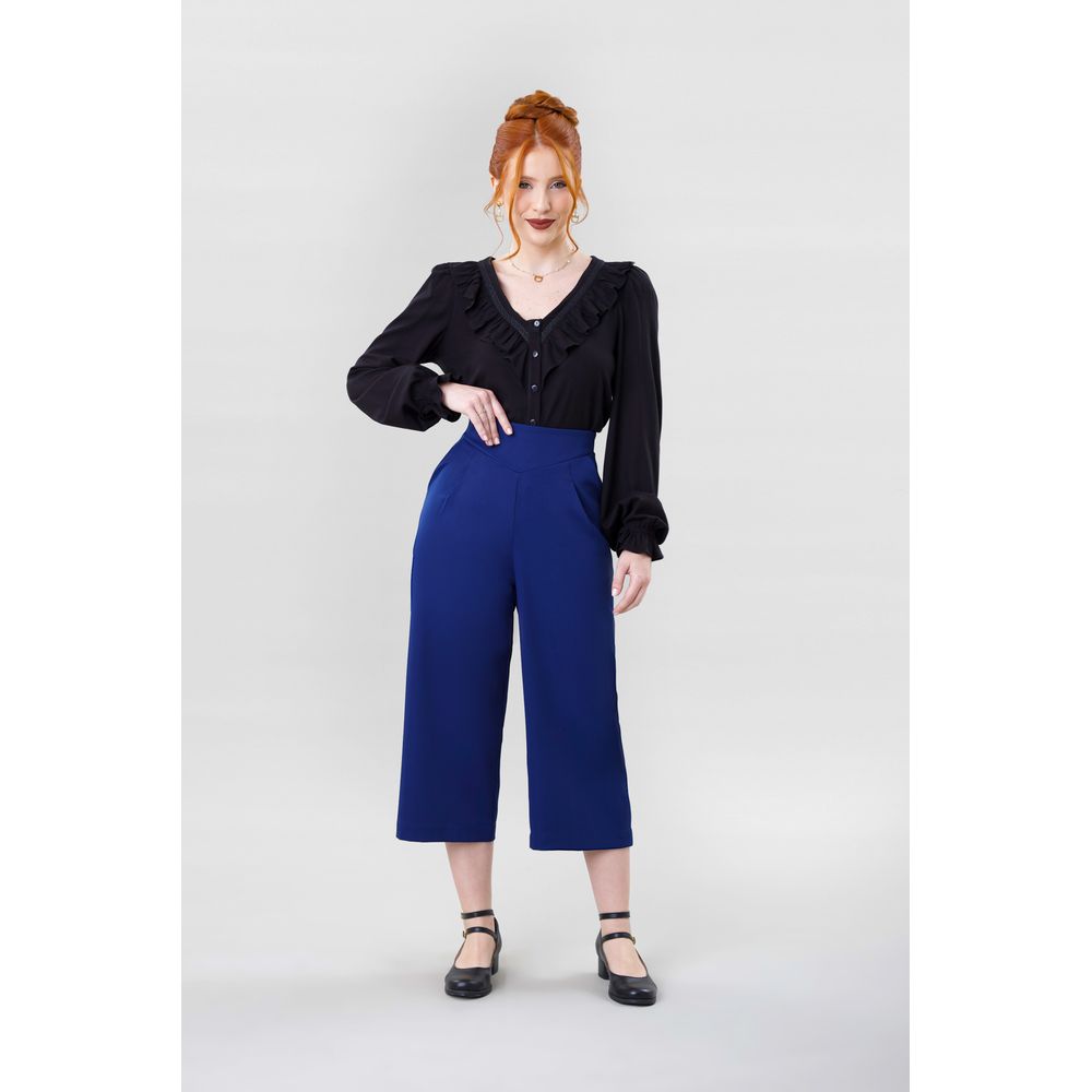 | Conceito Criativo | A “Calça de Alfaiataria Pantacourt Mary Shelley – Dark Blue” é uma criação desenvolvida para a cápsula A Arte em Palavras — Especial Literatura Gótica, da Coleção Futuras Relíquias — Inverno 2025 da Toda Frida. Inspirada nos figurinos de Bella Baxter, personagem do filme Pobres Criaturas — narrativa contemporânea que dialoga com os dilemas de Frankenstein, obra icônica escrita por Mary Shelley —, esta peça traz como destaque o cós em “V”, elemento marcante do guarda-roupa da personagem. Com modelagem pantacourt, acabamento de alfaiataria e cor clássica, une drama e sofisticação em uma proposta versátil e atemporal, pensada para mulheres que constroem sua própria identidade com liberdade e intensidade. |