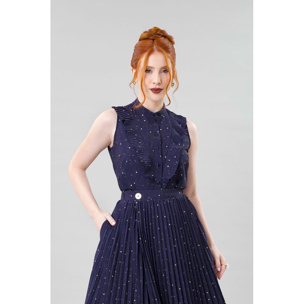 Conceito Criativo | A “Camisa Noite Estrelada” é uma criação desenvolvida para a cápsula Trama das Estrelas — Especial Cosmos, da Coleção Futuras Relíquias — Inverno 2025 da Toda Frida. Inspirada na icônica obra A Noite Estrelada, de Van Gogh, a peça traz uma estampa exclusiva e minimalista que remete a um céu estrelado em estilo poá — uma releitura delicada do universo cósmico pintado pelo artista. O babado plissado aplicado à parte frontal adiciona um toque romântico e sutil, trazendo movimento e poesia. Uma peça que une arte, delicadeza e um olhar contemporâneo sobre os clássicos. |