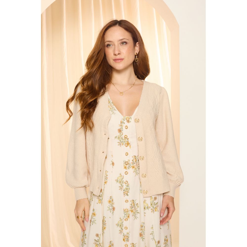 | Conceito Criativo | O Cardigan Honey é uma criação da coleção Meu Refúgio - Outono 2026 da Toda Frida. Inspirado no universo de Ursinho Pooh, ele traduz a sensação de aconchego e conforto em uma peça versátil e atemporal. Confeccionado em tricô, sua textura traz um toque macio e acolhedor, enquanto as padronagens em alto-relevo formam delicados desenhos que remetem aos favos de mel, um dos símbolos mais marcantes desse universo. Sua modelagem conta com decote em V, mangas levemente bufantes e punhos ajustados, criando uma silhueta feminina e confortável para o dia a dia. O fechamento frontal com botões metálicos dourados em formato de flor adiciona um acabamento especial, reforçando a conexão com a natureza presente na coleção. Um cardigan pensado para te envolver com conforto, como um abraço nos dias mais tranquilos. |
