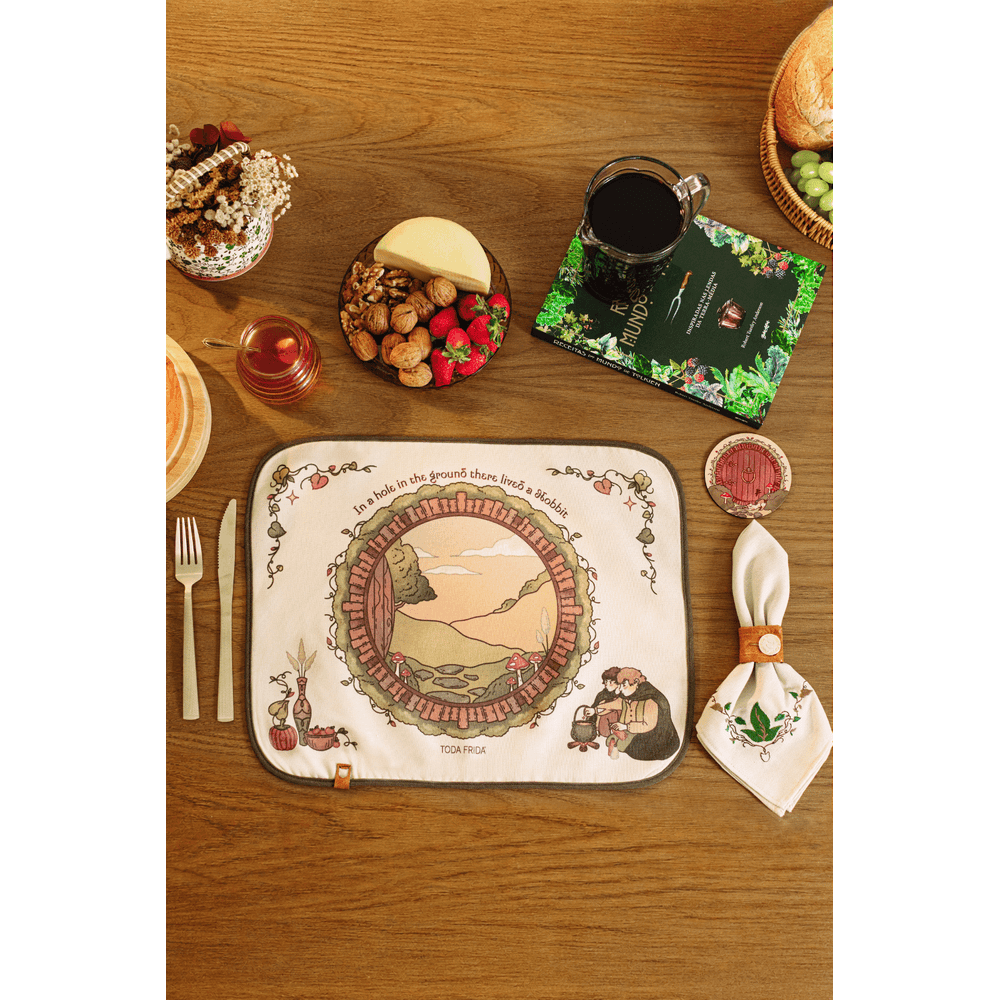 | Conceito Criativo | O Kit De Mesa Posta Minha Casa Hobbit é uma criação de edição especial da linha Casa TF, marcando o primeiro lançamento da marca voltado ao universo home. Inspirado no aconchego do lar e na simplicidade encantadora de O Hobbit, de J. R. R. Tolkien, o conjunto é composto por 1 jogo americano dupla face, 1 guardanapo de pano, 1porta-copo e 1 anel de guardanapo, traduzindo a atmosfera acolhedora do Condado em uma experiência completa à mesa. Confeccionado em linho misto, o jogo americano traz estampa exclusiva com a icônica porta redonda das tocas, acompanhada de elementos do cotidiano campestre e acabamento em viés, enquanto o guardanapo em tom cru recebe bordado delicado inspirado nas folhas de Lórien. O porta-copos em MDF apresenta uma releitura autoral da fachada Hobbit com detalhes que reforçam o universo da marca, e o anel de guardanapo em couro sintético caramelo finaliza a composição com um toque rústico e simbólico, destacando o botão metálico exclusivo Toda Frida inspirado nas inscrições do Um Anel. Cada kit corresponde a um lugar à mesa, sendo indicado adquirir mais unidades para compor mesas completas. |
