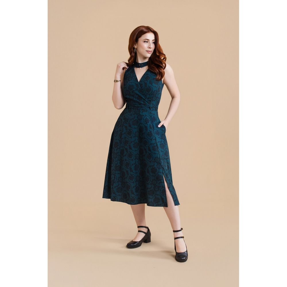 | Conceito Criativo | O Vestido Midi Floral Minerva — Dark Green é uma criação da coleção "Brumas de Vênus — Primavera 2025 da Toda Frida". Essa peça homenageia Minerva McGonagall, da saga Harry Potter, traduzindo sua força presença marcante em um design feminino e cheio de significado. A gola faz referência ao figurino da professora, enquanto os botões em formato de rosa remetem ao broche utilizado por ela. A estampa exclusiva traz arabescos e florais com aspecto gótico-antigo, em sintonia com a atmosfera do mundo bruxo. Entre os ornamentos, surgem elementos icônicos que celebram personagens femininas inesquecíveis: o vira-tempo de Hermione, o pomo de ouro de Ginny, o crânio de pássaro de Bellatrix e, em destaque, o broche cravejado que simboliza Minerva. Na versão Minerva, a estampa aparece em delicado ton sur ton, criando profundidade e sutileza. Uma peça criada para mulheres que vestem autenticidade, personalidade e conexão com histórias que atravessam gerações. |