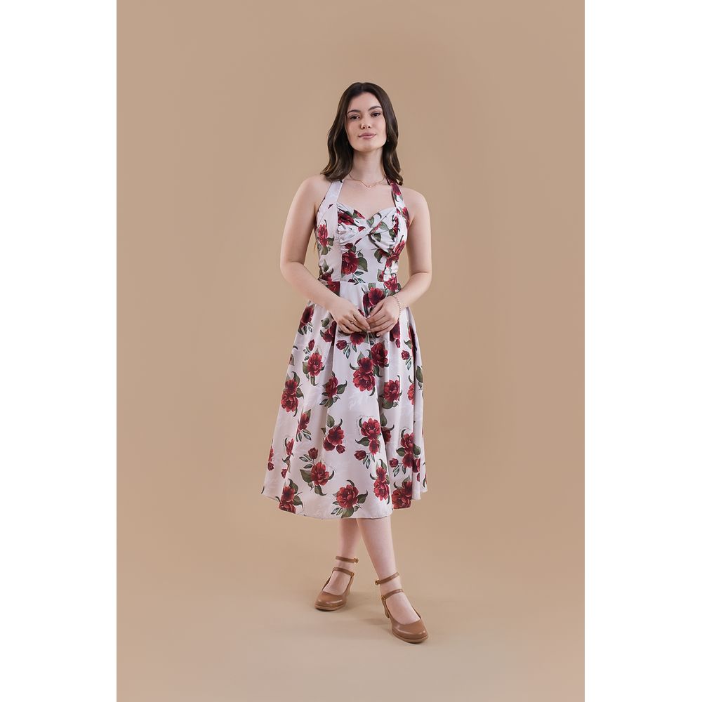 | Conceito Criativo | O Vestido Midi Marilyn é uma criação da coleção Brumas de Vênus — Verão 2026 da Toda Frida. Relançamento da estampa Marilyn Monroe, apresentada na coleção Outono/Inverno 2023, o modelo retorna em novas cores que remetem diretamente à imagem icônica da artista. O floral vermelho ganha destaque sobre fundos neutros em preto e areia, enquanto, de forma discreta, aparecem as citações “Who does she think she is? Marilyn Monroe?” e “I don't care about money. I just want to be wonderful.”, reforçando sua força e autenticidade. A modelagem midi com cintura marcada, alças e decote coração com torção cria uma silhueta feminina e elegante. Com bolsos laterais invisíveis e abertura nas costas com zíper, o vestido é finalizado com estampa exclusiva TF e aviamentação personalizada Toda Frida no banho ouro, unindo personalidade, feminilidade e presença em cada detalhe. |