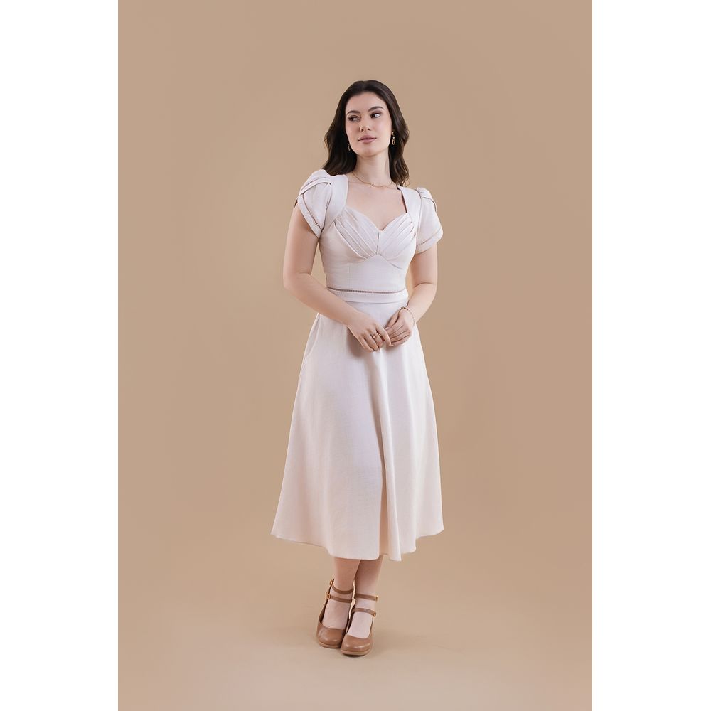 | Conceito Criativo | O Vestido Midi Rey é uma criação da coleção Brumas de Vênus — Verão 2026 da Toda Frida. Inspirado nos figurinos de Rey em Star Wars, o modelo traduz força e delicadeza em um visual leve e feminino, com drapeados suaves e recortes que remetem à estética da personagem. Confeccionado em tecido plano 100% algodão, garante frescor e conforto para o verão. O decote coração com pregas no busto valoriza o colo, enquanto a cintura marcada com renda vazada define a silhueta com leveza. As mangas curtas em formato tulipa recebem aplicação de renda vazada, trazendo textura e romantismo. Com bolsos laterais invisíveis e funcionais, abertura nas costas com zíper e aviamentos personalizados Toda Frida no banho níquel, é uma peça atemporal e cheia de significado. |