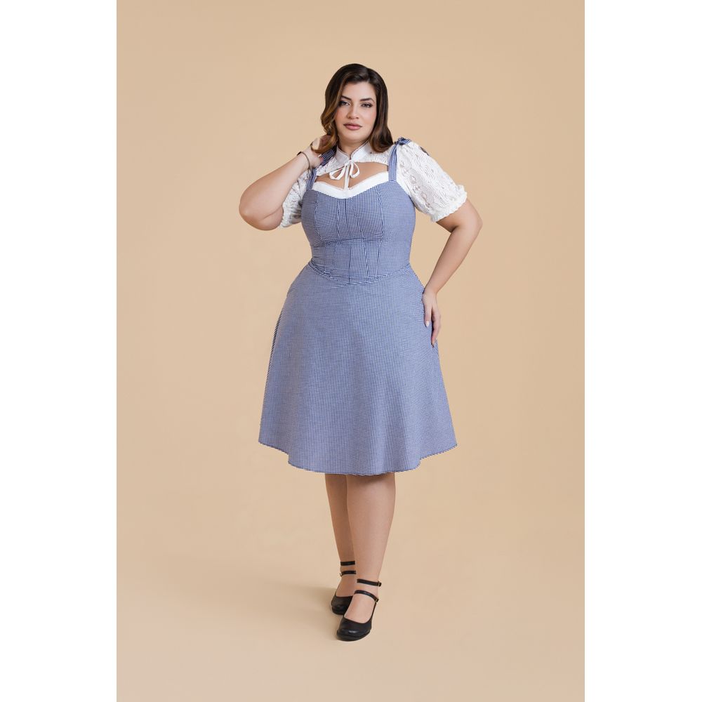 | Conceito Criativo | O Vestido/Salopete Chanel Xadrez Luna — Blue é uma criação da coleção "Brumas de Vênus — Primavera 2025 da Toda Frida". A peça homenageia duas mulheres inspiradoras do universo Potterhead: Ginny e Luna. A modelagem traz o busto com recorte corselet, que valoriza as curvas, enquanto as alças de amarrar permitem o ajuste perfeito nos ombros e adicionam um toque romântico característico da TF. Confeccionada em algodão, a saia em modelagem semi godê garante estrutura e leveza. Conectando tradição e modernidade, a estampa em padronagem xadrez vichy faz referência à herança britânica presente em toda a saga. Uma salopete versátil e atemporal, perfeita para compor seus looks de verão. |