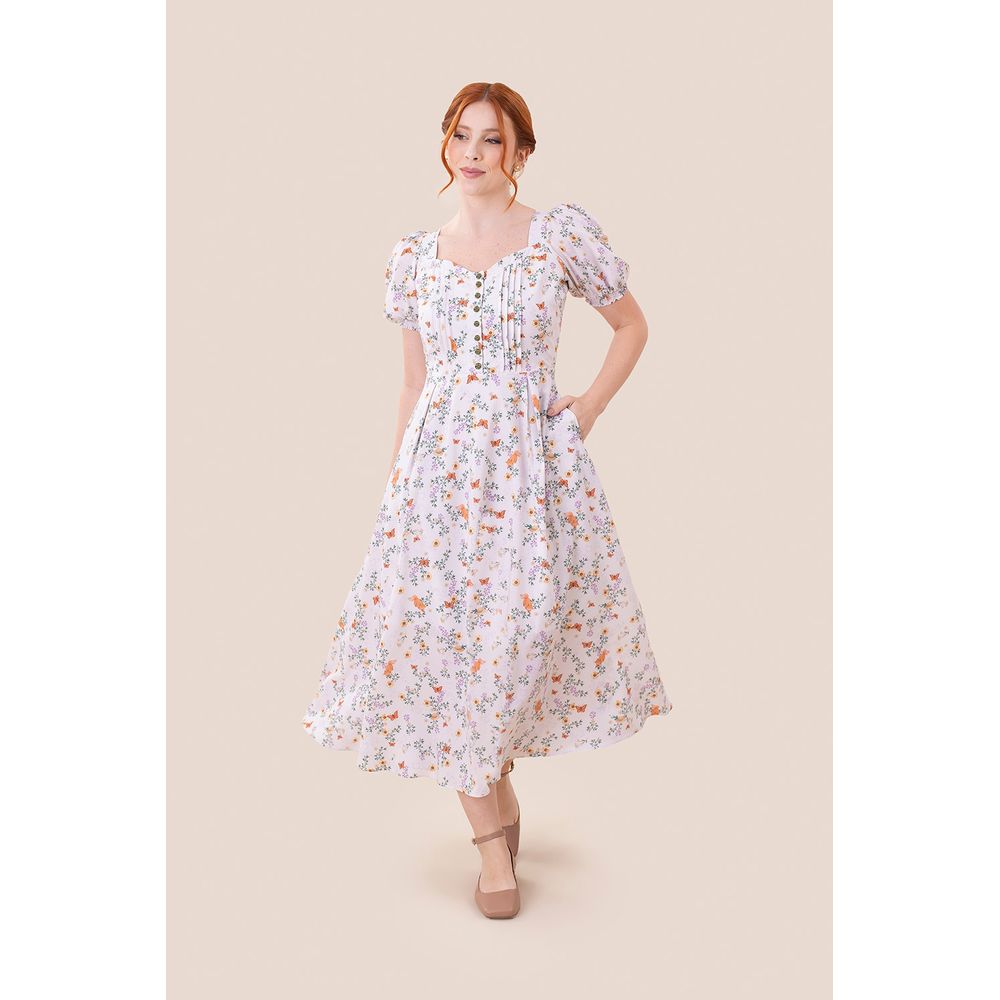 | Conceito Criativo | O Vestido Super Midi Anne - Off White é uma criação para a Coleção The Eras - 10 Anos Toda Frida, Verão 25. Inspirado pela série Anne With an E, ele combina delicadeza, romantismo e detalhes únicos em uma releitura encantadora de suas versões anteriores, lançadas nas coleções A Admiradora da Natureza e Revelar da Alvorada. Neste terceiro lançamento, o design foi repaginado com uma estampa autoral em tons suaves, trazendo elementos florais cottagecore, como girassóis, margaridas e lavandas, além do chapéu da personagem e a raposa, que conectam diretamente à essência de Anne. Com manga curta bufante, abertura funcional e detalhes como pregas e viés ajustável nas costas, este vestido combina conforto e personalidade. Sua modelagem midi campestre e bolsos laterais o tornam perfeito para momentos que pedem leveza e estilo. Criada para mulheres criativas e românticas que desejam vestir a sua própria história com inspiração. |