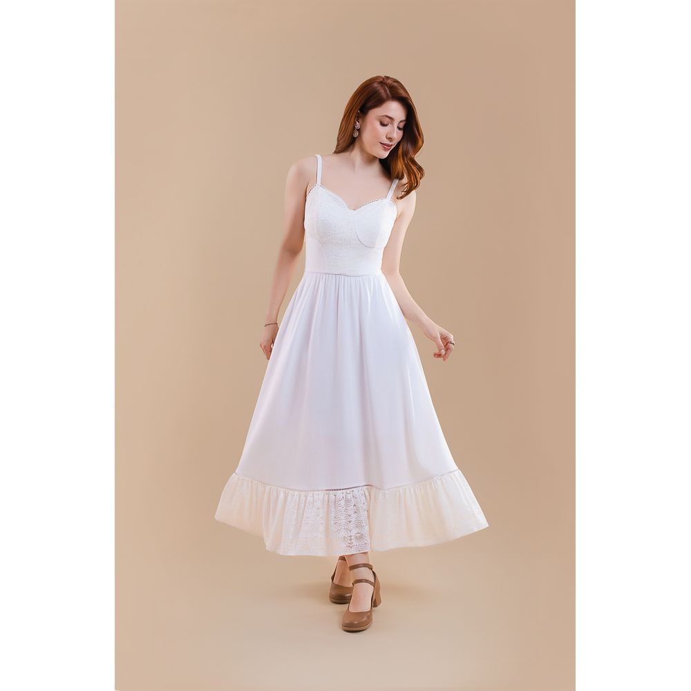 | Conceito Criativo | O "Vestido Super Midi Galadriel — Off-White" é uma criação da coleção Brumas de Vênus — Verão 2026 da Toda Frida. Ele reflete a estética luminosa de Galadriel de "O Senhor dos Anéis", unindo força suave e brilho sutil em um design autoral. O corpete estruturado contrasta delicadamente com a renda aplicada no busto e na barra, criando um efeito de luz silenciosa, assim como a presença imponente e serena da Senhora de Lothlórien. Confeccionado em viscose, o modelo revela feminilidade com calma e frescor. Uma peça que ilumina sem esforço, com poesia. |
